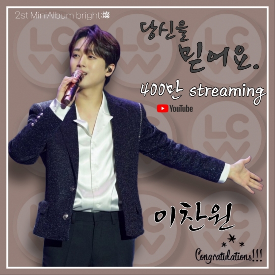 벌써 6개월 전 노래네요 ㅎㅎ 시간 정말 빨라요 당신을 믿어요 좋아하는노래인데 400만뷰를 달성했다고해서 팬마음 여러분들에게도 함께 공유하고 싶어서 글써봅니다 ㅎㅎ 아직 안들어본 분들이 있을까봐 링크도 가져왔어요 다들 당신을 믿어요 들으며 오늘도 행복한 저녁 하루 마무리 하시길 바랍니다! 다시한번 이찬원 가수님 400만뷰 달성 축하드립니다 쭉쭉 갑시다!!